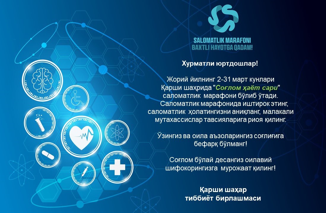 Қарши шаҳарида 2-мартдан 31 март кунлари “Соғлом хаёт сари” Саломатлик марафонига фаол иштирок этинг